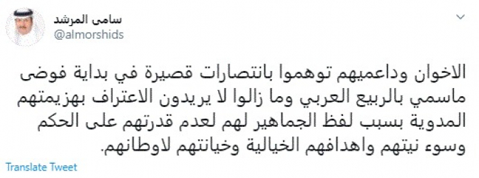 وقال في تغريدة عبر "تويتر" رصدها "المشهد العربي": "الإخوان وداعميهم توهموا بانتصارات قصيرة في بداية فوضى ما سمي بالربيع العربي وما زالوا لا يريدون الاعتراف بهزيمتهم المدوية بسبب لفظ الجماهير لهم لعدم قدرتهم على الحكم وسوء نيتهم وأهدافهم الخيالية وخيانتهم لأوطانهم".