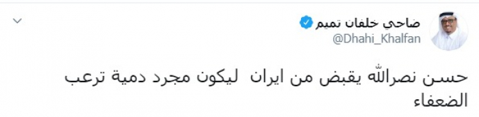 وكتب عبر تغريدة له على "تويتر" رصدها " المشهد العربي": "حسن نصرالله يقبض من إيران ليكون مجرد دمية ترعب الضعفاء".