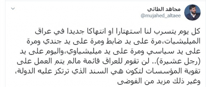 وكتب عبر تغريدة له على "تويتر" رصدها " المشهد العربي": "كل يوم يتسرب لنا استهتارا او انتهاكا جديدا في عراق المليشيات، مرة على يد ضابط ومرة على يد جندي ومرة على يد سياسي ومرة على يد ميليشياوي، واليوم على يد (رجل عشيرة)، لن تقوم للعراق قائمة مالم يتم العمل على تقوية المؤسسات لتكون هي السند الذي ترتكز عليه الدولة، وغير ذلك مزيد من الفوضى".