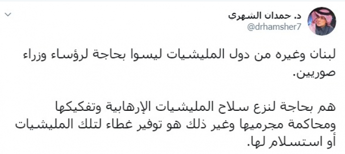 وكتب عبر تغريدة له على "تويتر" رصدها " المشهد العربي": "لبنان وغيره من دول المليشيات ليسوا بحاجة لرؤساء وزراء صوريين،هم بحاجة لنزع سلاح المليشيات الإرهابية وتفكيكها ومحاكمة مجرميها وغير ذلك هو توفير غطاء لتلك المليشيات أو استسلام لها".
