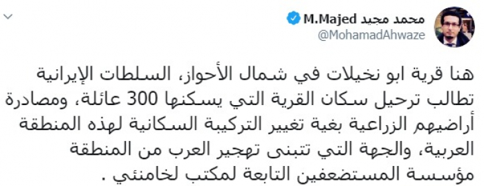 وكتب عبر تغريدة له على "تويتر" رصدها " المشهد العربي": "هنا قرية أبو نخيلات في شمال الأحواز، السلطات الإيرانية تطالب ترحيل سكان القرية التي يسكنها 300 عائلة، ومصادرة أراضيهم الزراعية بغية تغيير التركيبة السكانية لهذه المنطقة العربية، والجهة التي تتبنى تهجير العرب من المنطقة مؤسسة المستضعفين التابعة لمكتب لخامنئي".
