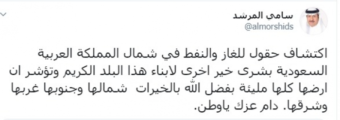 وكتب عبر تغريدة له على "تويتر" رصدها " المشهد العربي": "اكتشاف حقول للغاز والنفط في شمال المملكة العربية السعودية بشرة خير أخرى لأبناء هذا البلد الكريم وتؤشر أن أرضها كلها مليئة بفضل الله بالخيرات شمالها وجنوبها غربها وشرقها، دام عزك يا وطن".