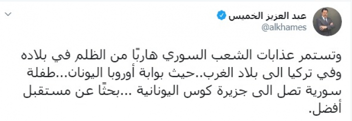 وكتب عبر تغريدة له على "تويتر" رصدها " المشهد العربي": "وتستمر عذابات الشعب السوري هاربًا من الظلم في بلاده وفي تركيا إلى بلاد الغرب، حيث بوابة أوروبا اليونان، طفلة سورية تصل إلى جزيرة كوس اليونانية، بحثًا عن مستقبل أفضل".