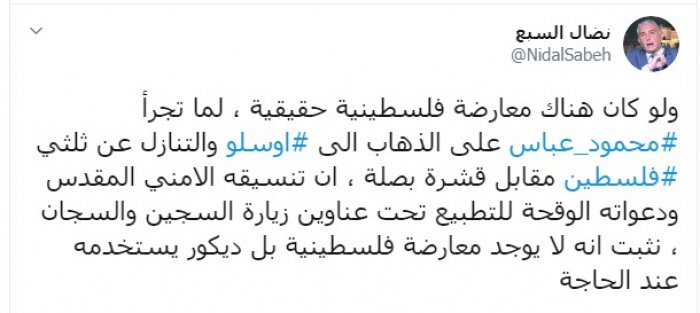 وكتب عبر تغريدة له على "تويتر" رصدها " المشهد العربي": "ولو كان هناك معارضة فلسطينية حقيقية، لما تجرأ محمود عباس على الذهاب إلى أوسلو والتنازل عن ثلثي فلسطين مقابل قشرة بصلة، إن تنسيقه الأمني المقدس ودعواته الوقحة للتطبيع تحت عناوين زيارة السجين والسجان ، تثبت أنه لا يوجد معارضة فلسطينية بل ديكور يستخدمه عند الحاجة".