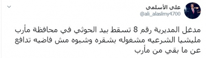 وكتب عبر تغريدة له على "تويتر" رصدها "المشهد العربي": "مدغل المديرية رقم 8 تسقط بيد الحوثي في محافظة مأرب، مليشيا الشرعية مشغولة بشقرة وشبوة مش فاضية تدافع عن ما بقي من مأرب".