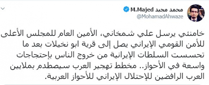 وكتب عبر تغريدة له على "تويتر" رصدها " المشهد العربي": "خامنئي يرسل علي شمخاني، الأمين العام للمجلس الأعلى للأمن القومي الإيراني يصل إلى قرية أبو نخيلات بعد ما تحسست السلطات الإيرانية من خروج الناس باحتجاجات واسعة في الأحواز، مخطط تهجير العرب سيصطدم بملايين العرب الرافضين للاحتلال الإيراني للأحواز العربية".