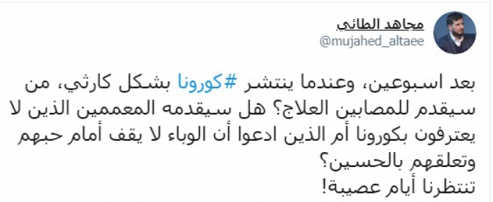 وكتب عبر تغريدة له على "تويتر" رصدها " المشهد العربي": "بعد أسبوعين، وعندما ينتشر كورونا بشكل كارثي، من سيقدم للمصابين العلاج؟ هل سيقدمه المعممين الذين لا يعترفون بكورونا أم الذين ادعوا أن الوباء لا يقف أمام حبهم وتعلقهم بالحسين؟ تنتظرنا أيام عصيبة".