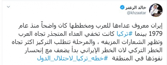 وكتب عبر تغريدة له على "تويتر" رصدها " المشهد العربي": "إيران معروف عداءها للعرب ومخططها كان واضحاً منذ عام 1979 بينما تركيا كانت تخفي العداء المتجذر تجاه العرب وتظهر الشعارات المزيفة، والمرحلة تتطلب التركيز أكثر تجاه الخطر التركي لأن الخطر الإيراني بدأ يضعف مع انحسار نفوذها في المنطقة".