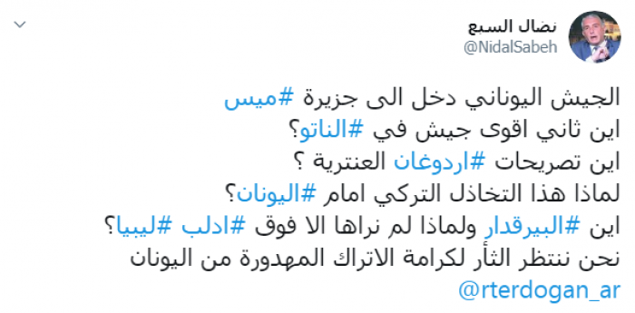 وكتب عبر تغريدة له على "تويتر" رصدها " المشهد العربي": "الجيش اليوناني دخل إلى جزيرة ميس، أين ثاني أقوى جيش في الناتو؟ أين تصريحات أردوغان العنترية ؟ لماذا هذا التخاذل التركي أمام اليونان؟ أين البيرقدار ولماذا لم نراها إلا فوق أدلب ليبيا؟ نحن ننتظر الثأر لكرامة الأتراك المهدورة من اليونان".