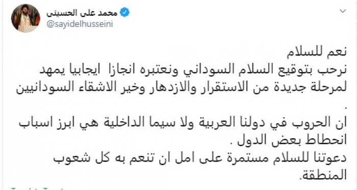 وقال في تغريدة عبر "تويتر" رصدها "المشهد العربي": "نعم للسلام نرحب بتوقيع السلام السوداني ونعتبره انجازا إيجابيا يمهد لمرحلة جديدة من الاستقرار والازدهار وخير الأشقاء السودانيين".