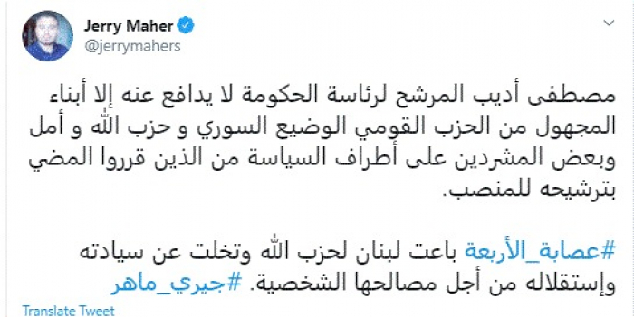 انتقد الكاتب الصحفي اللبناني جيري ماهر، اليوم، ترشيح السفير اللبناني مصطفى أديب لرئاسة الحكومة الجديدة في لبنان.