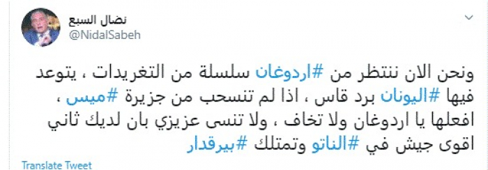 وقال في تغريدة عبر "تويتر" رصدها "المشهد العربي": "ونحن الآن ننتظر من أردوغان سلسلة من التغريدات، يتوعد فيها اليونان برد قاس، إذا لم تنسحب من جزيرة ميس، افعلها يا أردوغان ولا تخاف، ولا تنسى عزيزي بأن لديك ثاني أقوى جيش في الناتو وتمتلك بيرقدار".