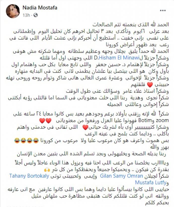 وتابعت: " شكراً لله لإنه رزقني بأولاد برغم وجودهم بعيد بس كانوا معايا ٢٤ ساعة على zoom وBotim فهونوا عليا العزل ورفعوا من معنوياتى، وشكرا كتير أوي بأه لشريك حياتى اللي تفانى في خدمتي واهتم بأكلي، ودايما كنت بلمح في عينه الرعب، بس هموت وأعرف هو كان مرعوب عليا ولا مرعوب من كورونا بهزر والله، ربنا يديله الصحة ويخليهولي وبجد تسلم الشدة اللي بتبين معدن الإنسان".