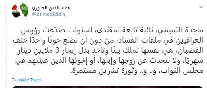 وقال في تغريدة عبر "تويتر" رصدها "المشهد العربي": "ماجدة التميمي، نائبة تابعة لمقتدى، لسنوات صدّعت رؤوس العراقيين في ملفات الفساد، من دون أن تضع حوتًا واحدًا خلف القضبان، هي نفسها تملك بيتًا وتأخذ بدل إيجار 3 ملايين دينار شهريًا، ولا نتحدث عن زوجها وإبنها، أو إخوتها الذين عينتهم في مجلس النواب، و.. و.. وثورة تشرين مستمرة".