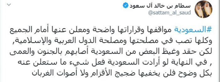 وكتب عبر تغريدة له على "تويتر" رصدها " المشهد العربي": "السعودية مواقفها وقراراتها واضحة ومعلن عنها أمام الجميع وكلها تصب في مصلحتها ومصلحة الدول العربية والإسلامية, لكن حقد وغيظ البعض من السعودية أصابهم بالجنون والعمى, في النهاية لو أرادت السعودية فعل شيء ما ستعلن عنه بكل وضوح فلن يخفيها ضجيج الأقزام ولا أصوات الغربان".
