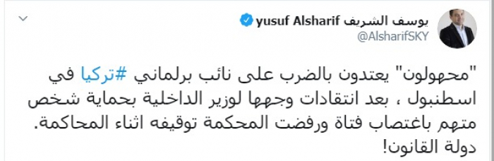 وكتب عبر تغريدة له على "تويتر" رصدها " المشهد العربي":"مجهولون" يعتدون بالضرب على نائب برلماني بتركيا في إسطنبول ، بعد انتقادات وجهها لوزير الداخلية بحماية شخص متهم باغتصاب فتاة ورفضت المحكمة توقيفه اثناء المحاكمة، دولة القانون"
