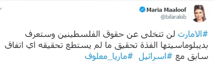 وكتبت عبر تغريدة لها على "تويتر" رصدها " المشهد العربي": "الإمارات لن تتخلى عن حقوق الفلسطينيين وستعرف بدبلوماسيتها الفذة تحقيق ما لم يستطع تحقيقه أي اتفاق سابق مع إسرائيل".