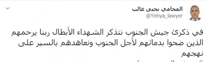 وكتب عبر تغريدة له على "تويتر" رصدها "المشهد العربي": "في ذكرى جيش الجنوب نتذكر الشهداء الأبطال ربنا يرحمهم الذين ضحوا بدمائهم لأجل الجنوب ونعاهدهم بالسير على نهجهم".