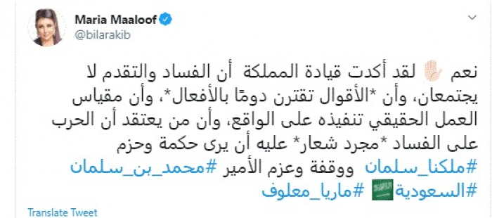 أشادت الإعلامية اللبنانية ماريا معلوف، اليوم، بمحاربة القيادة السعودية للفساد بالمملكة.