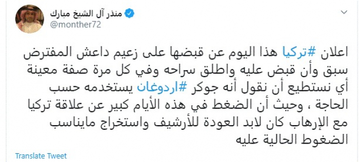 وقال في تغريدة عبر "تويتر" رصدها "المشهد العربي": "إعلان تركيا هذا اليوم عن قبضها على زعيم داعش المفترض سبق وأن قبض عليه وأطلق سراحه وفي كل مرة صفة معينة أي نستطيع أن نقول أنه جوكر أردوغان يستخدمه حسب الحاجة".