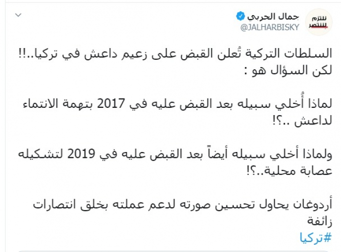 وكتب عبر تغريدة له على "تويتر" رصدها " المشهد العربي": "السلطات التركية تُعلن القبض على زعيم داعش في تركيا، لكن السؤال هو، لماذا أُخلى سبيله بعد القبض عليه في 2017 بتهمة الانتماء لداعش، ولماذا أخلي سبيله أيضاً بعد القبض عليه في 2019 لتشكيله عصابة محلية، أردوغان يحاول تحسين صورته لدعم عملته بخلق انتصارات زائفة".