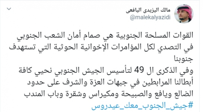 وكتب عبر تغريدة له على "تويتر" رصدها "المشهد العربي": "القوات المسلحة الجنوبية هي صمام أمان الشعب الجنوبي في التصدي لكل المؤامرات الإخوانية الحوثية التي تستهدف جنوبنا، وفي الذكرى الـ 49 لتأسيس الجيش الجنوبي نحيي كافة أبطالنا المرابطين في جبهات العزة والشرف على حدود الضالع ويافع والصبيحة ومكيراس وشقرة وباب المندب".
