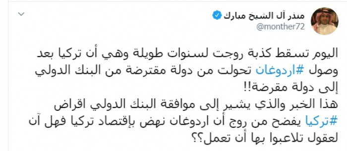 وكتب عبر تغريدة له على "تويتر" رصدها " المشهد العربي": "اليوم تسقط كذبة روجت لسنوات طويلة وهي أن تركيا بعد وصول أردوغان تحولت من دولة مقترضة من البنك الدولي إلى دولة مقرضة، هذا الخبر والذي يشير إلى موافقة البنك الدولي اقراض تركيا يفضح من روج أن أردوغان نهض باقتصاد تركيا فهل آن لعقول تلاعبوا بها أن تعمل".