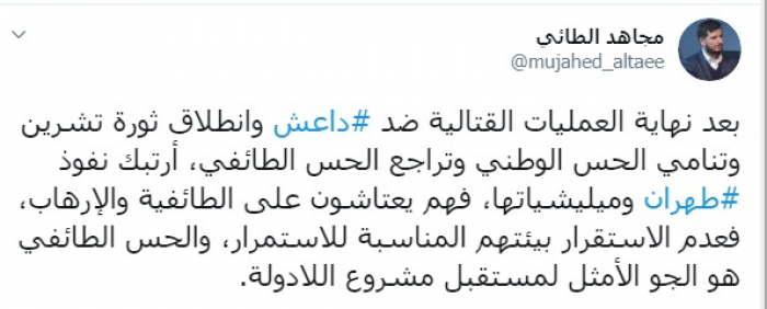وكتب عبر تغريدة له على "تويتر" رصدها " المشهد العربي": "بعد نهاية العمليات القتالية ضد داعش وانطلاق ثورة تشرين وتنامي الحس الوطني وتراجع الحس الطائفي، أرتبك نفوذ طهران ومليشياتها، فهم يعتاشون على الطائفية والإرهاب، فعدم الاستقرار بيئتهم المناسبة للاستمرار، والحس الطائفي هو الجو الأمثل لمستقبل مشروع اللادولة".