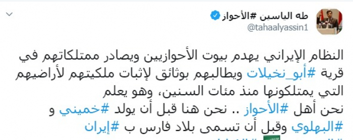 وكتب عبر تغريدة له على "تويتر" رصدها " المشهد العربي": "النظام الإيراني يهدم بيوت الأحوازيين ويصادر ممتلكاتهم في قرية أبو نخيلات ويطالبهم بوثائق لإثبات ملكيتهم لأراضيهم التي يمتلكونها منذ مئات السنين، وهو يعلم نحن أهل الأحواز نحن هنا قبل أن يولد خميني و البهلوي وقبل أن تسمى بلاد فارس بإيران".