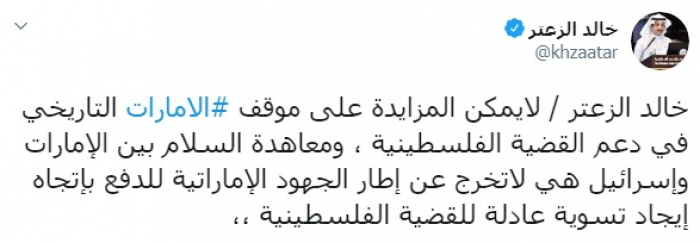 وكتب عبر تغريدة له على "تويتر" رصدها " المشهد العربي": " لا يمكن المزايدة على موقف الإمارات التاريخي في دعم القضية الفلسطينية، ومعاهدة السلام بين الإمارات وإسرائيل هي لا تخرج عن إطار الجهود الإماراتية للدفع باتجاه إيجاد تسوية عادلة للقضية الفلسطينية".
