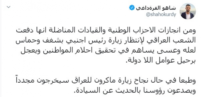 وكتب عبر تغريدة له على "تويتر" رصدها " المشهد العربي": "ومن انجازات الأحزاب الوطنية والقيادات المناضلة أنها دفعت الشعب العراقي لانتظار زيارة رئيس أجنبي بشغف وحماس لعله وعسى يساهم في تحقيق أحلام المواطنين ويعجل برحيل عوامل اللا دولة، وطبعا في حال نجاح زيارة ماكرون للعراق سيخرجون مجدداً ويصدعون رؤوسنا بالحديث عن السيادة".