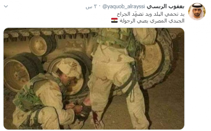 وكتب عبر تغريدة له على "تويتر" رصدها " المشهد العربي": "يد تحمي البلد ويد تضمِّد الجراح، الجندي المصري يعني الرجولة".