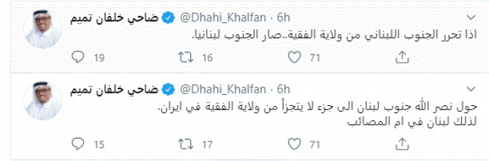 وكتب في تغريدات عبر "تويتر" رصدها "المشهد العربي": "حول نصر الله جنوب لبنان إلى جزء لا يتجزأ من ولاية الفقية في إيران. لذلك لبنان في أم المصائب".