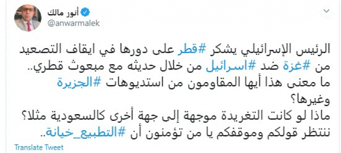 وقال في تغريدة عبر "تويتر" رصدها "المشهد العربي": "الرئيس الإسرائيلي يشكر قطر على دورها في إيقاف التصعيد من غزة ضد إسرائيل من خلال حديثه مع مبعوث قطري.. ما معنى هذا أيها المقاومون من استديوهات الجزيرة وغيرها؟".