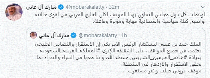 آل عاتي يُشيد بالعاهل البحريني بعد تصريحاته عن السعودية