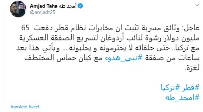 وقال في تغريدة عبر "تويتر" رصدها "المشهد العربي": "وثائق مسربة تثبت أن مخابرات نظام قطر دفعت 65 مليون دولار رشوة لنائب أردوغان لتسريع الصفقة العسكرية مع تركيا.. حتى حلفائه لا يحترمونه و يحلبونه.... ويأتي هذا بعد ساعات من صفقة نبي هدوء مع كيان حماس المختطف لغزة".