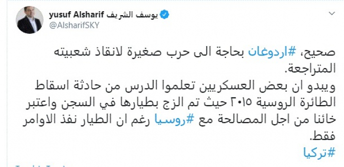 وكتب في تغريدة عبر "تويتر" رصدها "المشهد العربي": "صحيح، أردوغان بحاجة إلى حرب صغيرة لإنقاذ شعبيته المتراجعة".