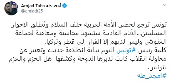 وقال في تغريدة عبر "تويتر" رصدها "المشهد العربي": "تونس ترجع لحضن الأمة العربية حلف السلام وتُطلق الإخوان المسلمين...الأيام القادمة ستشهد محاسبة ومعاقبة لجماعة الغنوشي وليس لديهم إلا الفرار إلى قطر وتركيا".