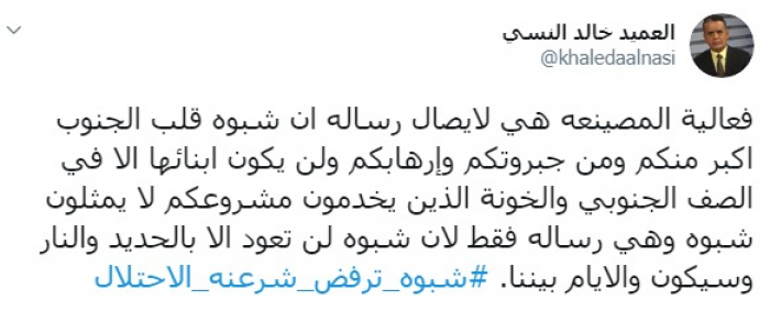 وكتب عبر تغريدة له على "تويتر" رصدها "المشهد العربي": "فعالية المصينعة هي لإيصال رسالة أن شبوة قلب الجنوب أكبر منكم ومن جبروتكم وإرهابكم ولن يكون أبناؤها إلا في الصف الجنوبي، والخونة الذين يخدمون مشروعكم لا يمثلون شبوة وهي رسالة فقط لأن شبوة لن تعود إلا بالحديد والنار وسيكون، والأيام بيننا".