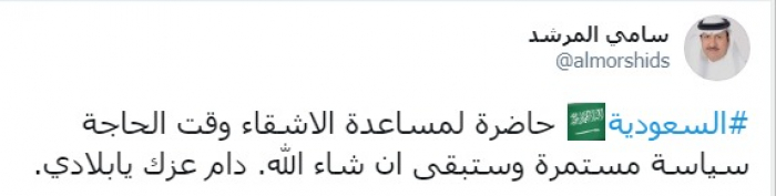 وكتب عبر تغريدة له على "تويتر" رصدها " المشهد العربي": " السعودية حاضرة لمساعدة الأشقاء وقت الحاجة، سياسة مستمرة وستبقى إن شاء الله، دام عزك يا بلادي".