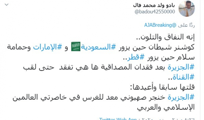 وكتب عبر تغريدة له على "تويتر" رصدها " المشهد العربي": "إنه النفاق والتلون، كوشنر شيطان حين يزور السعودية والإمارات وحمامة سلام حين يزور قطر، الجزيرة بعد فقدان المصداقية ها هي تفقد حتى لقب القناة، قلتها سابقا وأعيدها، الجزيرة خنجر صهيوني معد للغرس في خاصرتي العالمين الإسلامي والعربي".