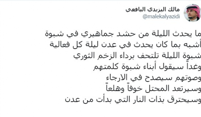 وكتب عبر تغريدة له على "تويتر" رصدها "المشهد العربي": "ما يحدث الليلة من حشد جماهيري في شبوة، أشبه بما كان يحدث في عدن ليلة كل فعالية، شبوة الليلة تلتحف برداء الزخم الثوري، وغدا سيقول أبناء شبوة كلمتهم وصوتهم سيصدح في الأرجاء، وسيرتعد المحتل خوفا وهلعا، وسيحترق بذات النار التي بدأت من عدن".