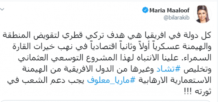 وكتبت عبر تغريدة لها على "تويتر" رصدها " المشهد العربي": "كل دولة في إفريقيا هي هدف تركي قطري لتقويض المنطقة والهيمنة عسكرياً أولاً وثانياً اقتصادياً في نهب خيرات القارة السمراء، علينا الانتباه لهذا المشروع التوسعي العثماني وتخليص تشاد وغيرها من الدول الإفريقية من الهيمنة الاستعمارية الإرهابية ، ويجب دعم الشعب في ثورته".