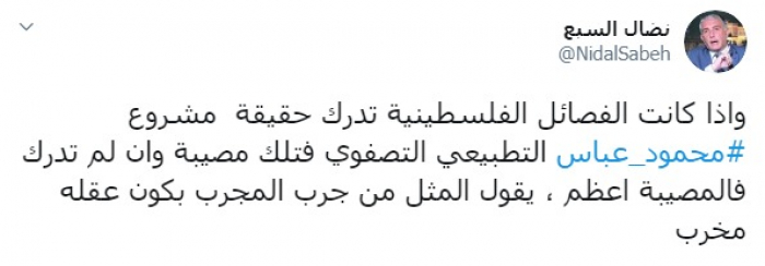 وكتب عبر تغريدة له على "تويتر" رصدها " المشهد العربي": "وإذا كانت الفصائل الفلسطينية تدرك حقيقة مشروع محمود عباس التطبيعي التصفوي، فتلك مصيبة وإن لم تدرك فالمصيبة أعظم ، يقول المثل من جرب المجرب بكون عقله مخرب".