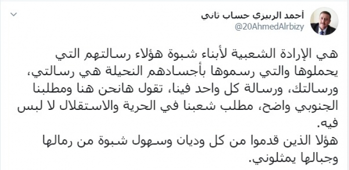 وكتب عبر تغريدة له على "تويتر" رصدها " المشهد العربي": "هي الإرادة الشعبية لأبناء شبوة هؤلاء رسالتهم التي يحملوها والتي رسموها بأجسادهم النحيلة هي رسالتي، ورسالتك، ورسالة كل واحد فينا، تقول ها نحن هنا ومطلبنا الجنوبي واضح، مطلب شعبنا في الحرية والاستقلال لا لبس فيه، هؤلاء الذين قدموا من كل وديان وسهول شبوة من رمالها وجبالها يمثلوني".