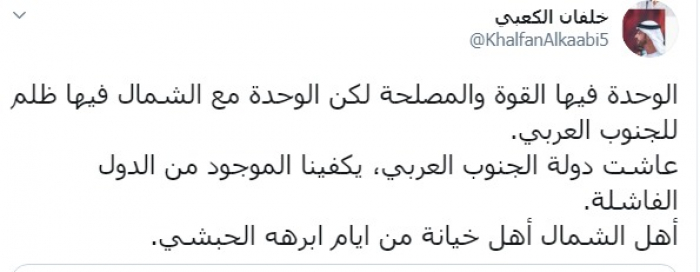 وكتب عبر تغريدة له على "تويتر" رصدها " المشهد العربي": "الوحدة فيها القوة والمصلحة لكن الوحدة مع الشمال فيها ظلم للجنوب العربي، عاشت دولة الجنوب العربي، يكفينا الموجود من الدول الفاشلة، أهل الشمال أهل خيانة من أيام أبرهة