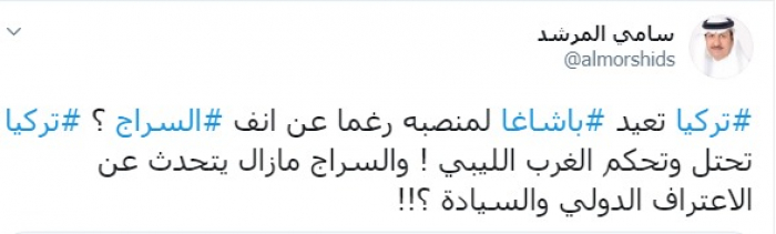 وكتب عبر تغريدة له "تويتر" رصدها " المشهد العربي": "تركيا تعيد باشاغا لمنصبه رغما عن أنف السراج ، تركيا تحتل وتحكم الغرب الليبي، والسراج مازال يتحدث عن الاعتراف الدولي والسيادة".
