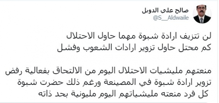 وكتب عبر تغريدة له على "تويتر" رصدها " المشهد العربي": "لن تتزيف إرادة شبوة مهما حاول الاحتلال، كم محتل حاول تزوير إرادة الشعوب وفشل، منعتهم مليشيات الاحتلال اليوم من الالتحاق بفعالية رفض تزوير إرادة شبوة في المصينعة ورغم ذلك حضرت شبوة، كل فرد منعته مليشياتهم اليوم مليونية بحد ذاته".