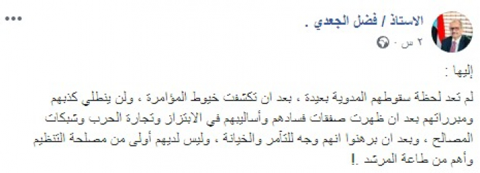 وكتب عبر تغريدة له على "تويتر" رصدها " المشهد العربي": "لم تعد لحظة سقوطهم المدوية بعيدة، بعد ان تكشفت خيوط المؤامرة، ولن ينطلي كذبهم ومبرراتهم بعد أن ظهرت صفقات فسادهم وأساليبهم في الابتزاز وتجارة الحرب وشبكات المصالح ، وبعد أن برهنوا أنهم وجه للتآمر والخيانة ، وليس لديهم أولى من مصلحة التنظيم وأهم من طاعة المرشد".