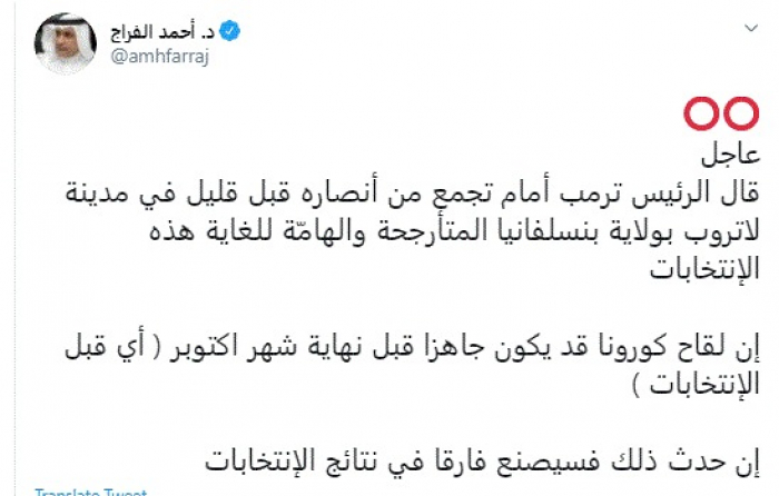 وكتب في تغريدة عبر "تويتر" رصدها "المشهد العربي": "قال الرئيس ترمب أمام تجمع من أنصاره قبل قليل في مدينة لاتروب بولاية بنسلفانيا المتأرجحة والهامّة للغاية هذه الإنتخابات.. إن لقاح كورونا قد يكون جاهزا قبل نهاية شهر اكتوبر ( أي قبل الإنتخابات).. إن حدث ذلك فسيصنع فارقا في نتائج الإنتخابات".